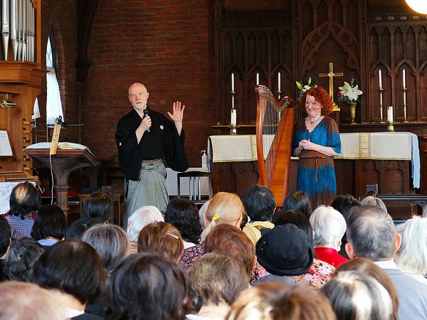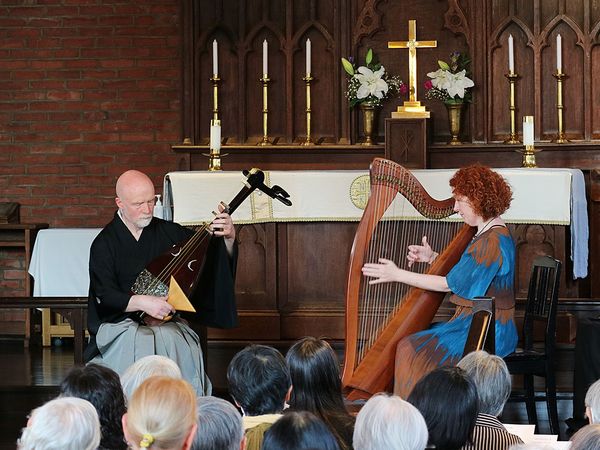 | これまでに礼拝堂で聞いたことのない薩摩琵琶の音色とアイリッシュハープの音色が不思議に溶けあって、 心地よい温かな空間に響きあっていました。 とても素晴らしかったです。 礼拝堂に入りきれないほどの来場者(120~130名)の対応が難しく、 初めての経験でしたが、会館でのプロジェクターでの視聴も行いました。 その会館では、音も映像もいまいちでしたが、休憩で帰られる方もなく、 聞き入ってそして見入ってくださいました。 音楽委員会委員長:里見久美子 |
